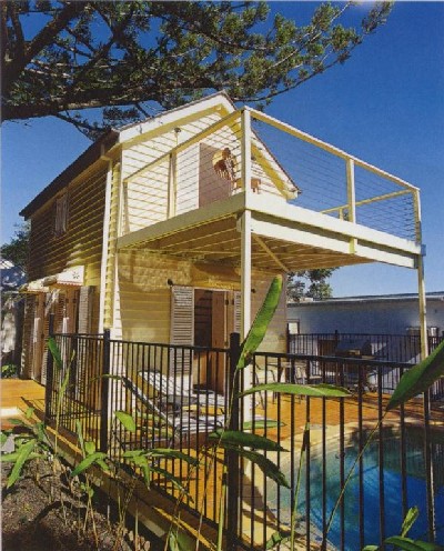 Click image to enlarge. These self contained and traditional style properties make two perfect holiday retreats right in the centre of Port Douglas. The cottage (sleeps 2 people) has an enormous loft bedroom and its own private sundeck with sunset views over the Marina and distant Daintree Rainforest. Perfect for couples and honeymooners. The Lodge sleeps 4 people and accommodates small families, the 2 generous bedrooms (1 Queen + 2 King singles) are separated by a large lounge and dining area with a large veranda and pool deck. Both properties benefit from